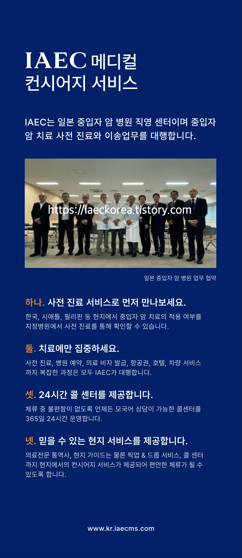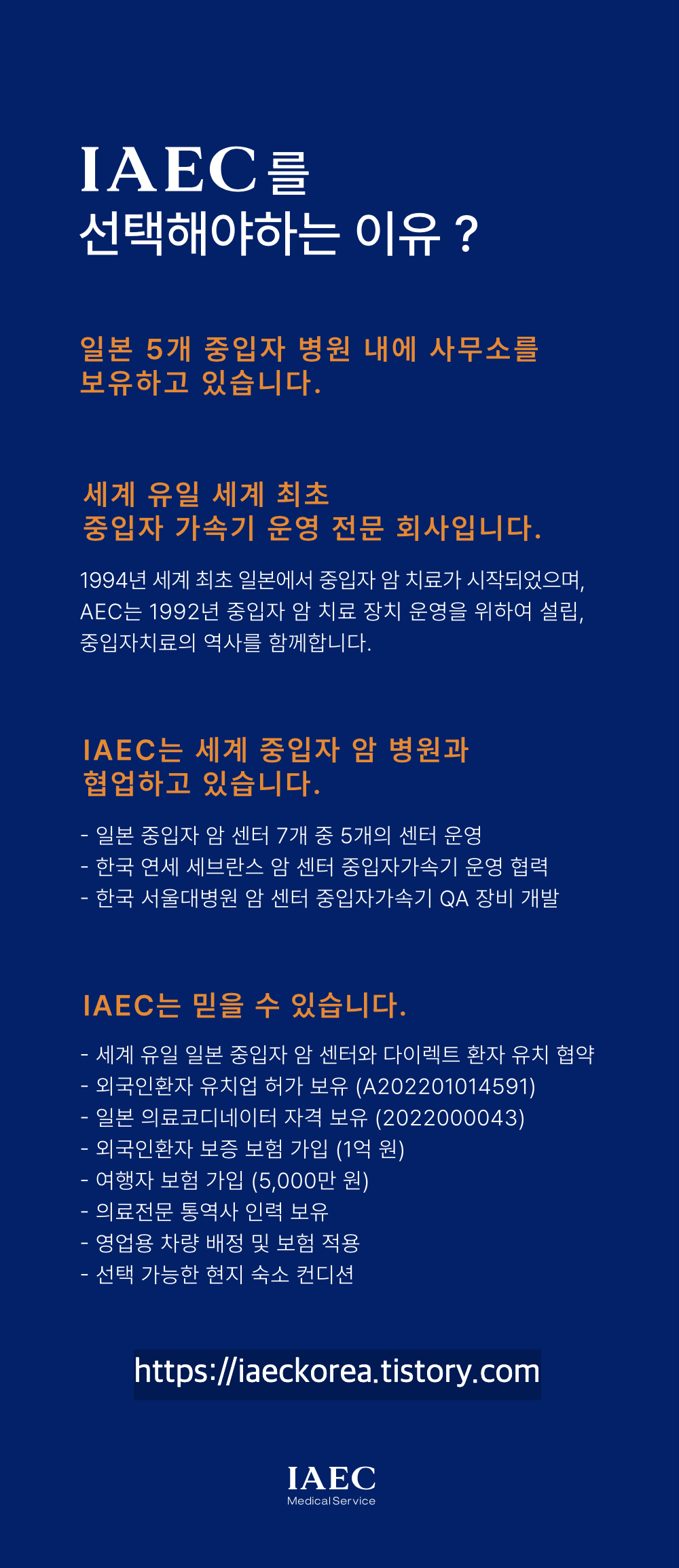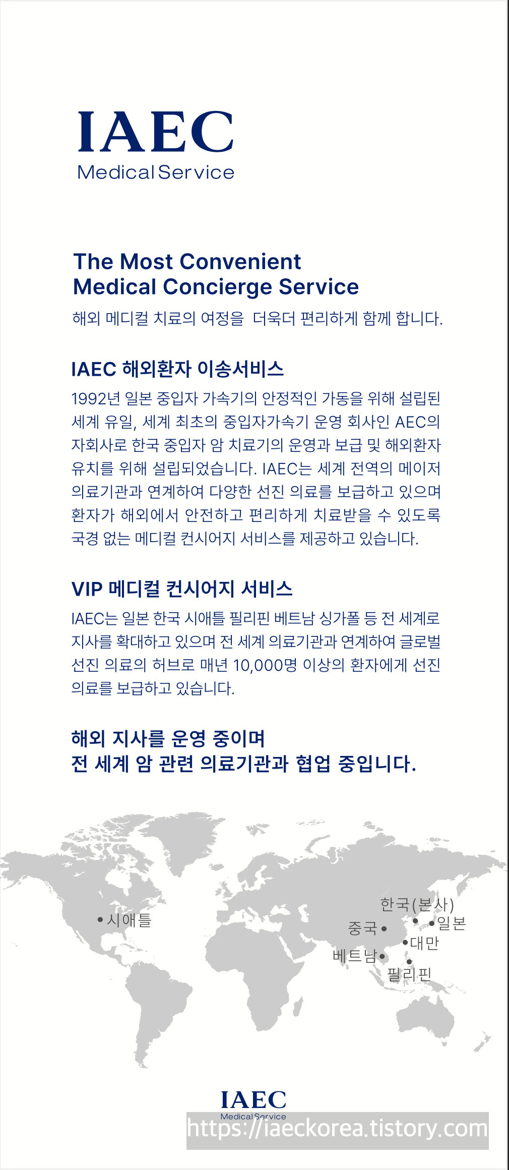 Founded in 1992 for the stable operation of the Japanese baryon accelerator, it is a subsidiary of AEC, the world's only and first baryon accelerator operating company, and was established to operate and distribute baryon cancer treatments in Korea and attract overseas patients. IAEC is working with major medical institutions around the world to distribute a variety of advanced healthcare services and provides borderless medical concierge services to ensure that patients are safely and conveniently treated overseas.